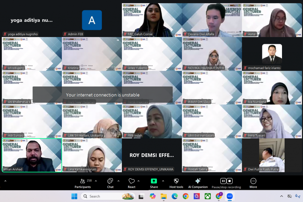 Kegiatan General Lecturer kali ini menjadi ajang kolaborasi internasional antara FEB UNIKAMA dengan Dr. Imran Arshad, seorang dosen terkemuka dari Faculty of Management Sciences Sister Riphah International University.
