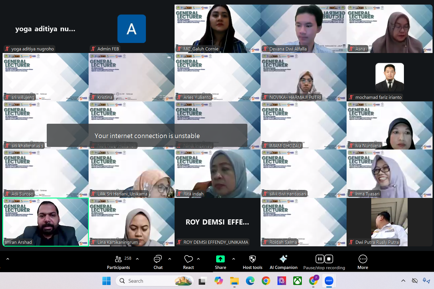 General Lecturer ini dilaksanakan pada hari Rabu, 10 Desember 2025, secara virtual melalui platform ruang pertemuan daring (Zoom Meeting). Meskipun diselenggarakan secara daring, acara ini mendapat sambutan yang sangat antusias dan diikuti oleh seluruh mahasiswa aktif di lingkungan FEB UNIKAMA, menunjukkan minat besar generasi muda terhadap topik yang diangkat.