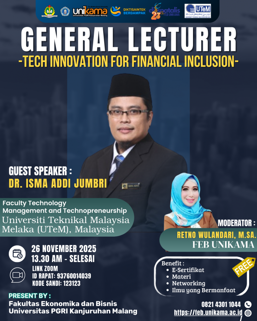 Kegiatan ini berlangsung pada (26/11/2025) dalam pertemuan online melalui ruang Zoom. Acara ini diikuti oleh seluruh Mahasiswa Aktif di lingkungan FEB UNIKAMA. General Lecturer ini mengangkat tema “Tech Innovation for Financial Inclusion: Empowering SMEs and Micro-Entrepreneurs Through Digital Finance”