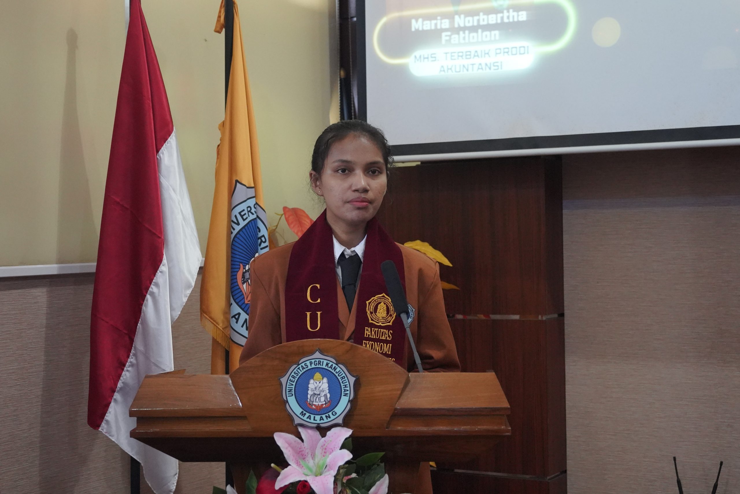Mewakili rekan-rekannya, salah satu lulusan, Maria Norbertha Fatlolon Program Studi Akuntansi, menyampaikan rasa syukur dan refleksi mendalam dalam sambutannya. Ia menegaskan bahwa gelar yang diraih hari ini bukanlah garis finis, melainkan titik awal perjuangan yang sesungguhnya.
