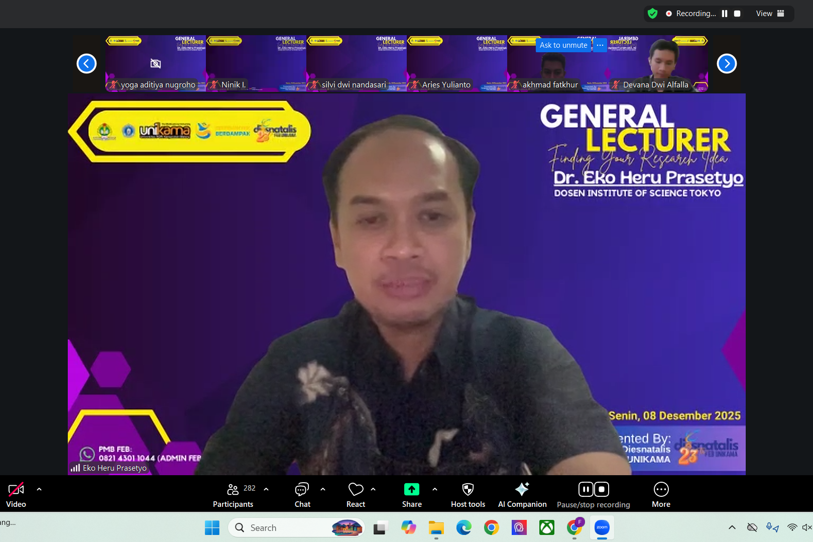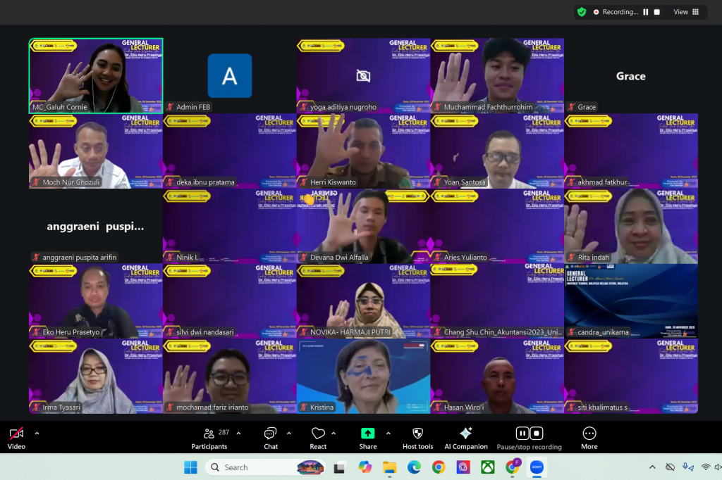General Lecturer ini berlangsung pada hari Senin, (08/12/2025), dan dilaksanakan secara virtual melalui ruang pertemuan daring (Zoom Meeting). Acara ini mendapat sambutan antusias dan diikuti oleh seluruh mahasiswa aktif di lingkungan FEB UNIKAMA.